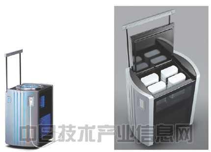 在東京車展上展示了作為可搬運發電機使用的燃料電池系統“FC Dock”(左)。在燃料瓶中填充水合肼,安裝到系統上使用(右)