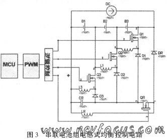 系統(tǒng)中, 及時(shí)檢測(cè)電池組中各電池的狀態(tài)信息, 送入MCU 中, 通過算法處理, 控制PWM的輸出, 驅(qū)動(dòng)開關(guān)器件的導(dǎo)通和關(guān)斷. 當(dāng)某個(gè)電池電壓較高時(shí), 相應(yīng)的開關(guān)器件導(dǎo)通, 電池將能量?jī)?chǔ)存到相應(yīng)的電感中, 當(dāng)開關(guān)斷開后, 能量轉(zhuǎn)移到下游的電池, 多余能量轉(zhuǎn)移到公共電容上并回饋給充電電路。