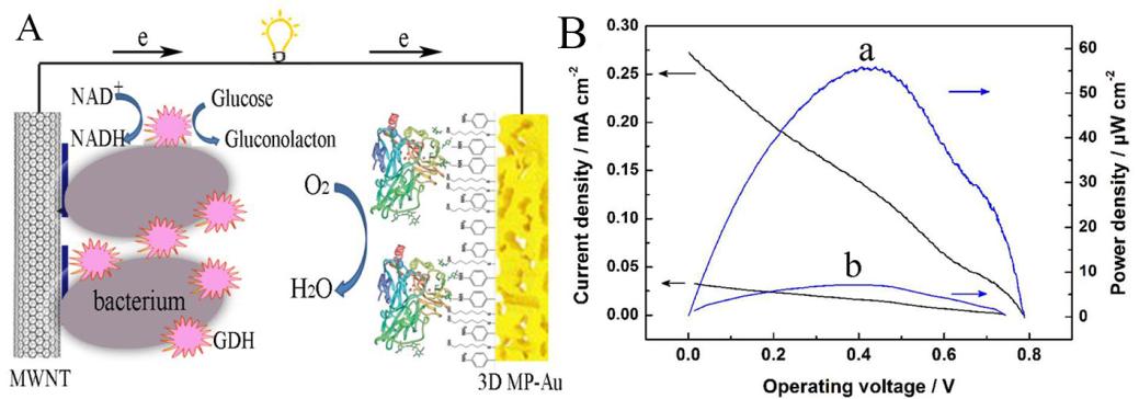 圖2.(A)生物燃料電池示意圖,生物陽極為bacteria-GDH/聚亞甲基藍(lán)/多壁碳納米管/玻碳電極,生物陰極為漆酶固定的三維多孔金膜。(B)電池功率密度隨輸出電壓的變化曲線。a,生物陰極為漆酶固定的三維多孔金膜;b,生物陰極為圓盤金電極。