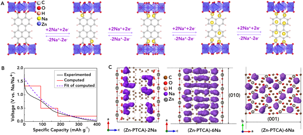 鈉離子在Zn-PTCA中的嵌入位點(diǎn)(A)、嵌入電壓(B)以及遷移通道(C)