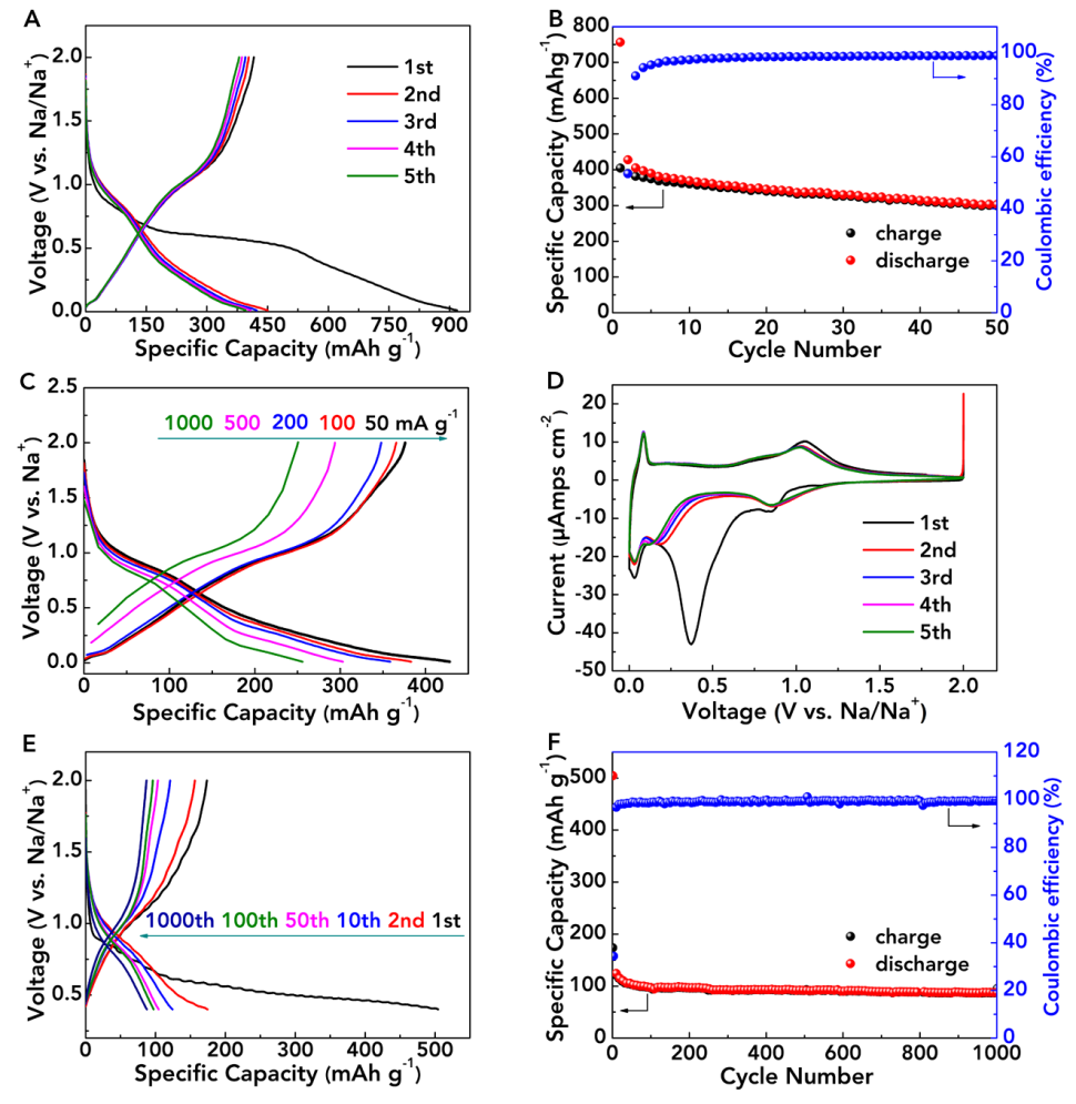 Zn-PTCA的電化學(xué)性能:充放電曲線(xiàn)(A)、循環(huán)性能(B)、倍率性能(C)以及CV曲線(xiàn)(D)