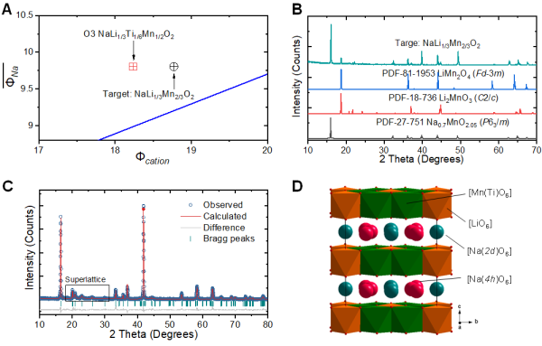 圖2.根據陽離子勢設計富鈉O3材料。(A)Na-Li-Mn(Ti)-O的陽離子勢分析;(B)初始組成Na[Li1/3Mn2/3]O2的XRD圖譜和相關標準圖譜;(C)O3-Na[Li1/3Ti1/6Mn1/2]O2的結構精修XRD圖譜;(D)[Li1/3Ti1/6Mn1/2]O2層中Li/Mn(Ti)有序排布的結構示意圖