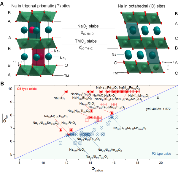 圖1.陽離子勢及其在鈉離子層狀氧化物中的應用。(A)典型P2型和O3型鈉離子層狀氧化物晶體結構示意圖;(B)具有不同鈉含量、不同過渡金屬氧化態和組成的P2型和O3型鈉離子層狀氧化物在以陽離子勢Φcation為橫坐標,鈉的加權平均離子勢為縱坐標的直角坐標系中的分布圖
