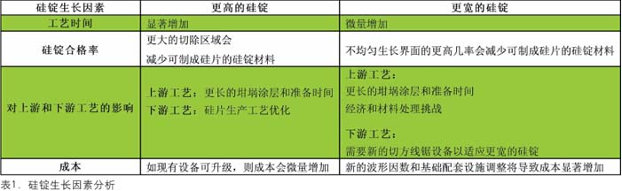 還有其它一些與生產(chǎn)更大硅錠相關(guān)的上游和下游生產(chǎn)問(wèn)題,這些問(wèn)題會(huì)影響生產(chǎn)成本,因此必須在固定資產(chǎn)設(shè)備的采購(gòu)決策中加以考量。從上游來(lái)說(shuō),坩堝成本將隨著坩堝尺寸的增加而增加,而坩堝的準(zhǔn)備成本也會(huì)隨著涂層工藝的日益復(fù)雜而增加。從下游來(lái)說(shuō),更寬的硅錠可能需要更大的切方線鋸設(shè)備來(lái)進(jìn)行處理。最后,如果硅錠生長(zhǎng)和線切割操作之間的生產(chǎn)線平衡無(wú)法維持,總體硅片生產(chǎn)力也會(huì)下降。生產(chǎn)更多可制成硅片的硅錠材料可能會(huì)增加生產(chǎn)能力和爐子的利用率,但如果線切割操作無(wú)法處理增加后的材料或波形因數(shù),就可能會(huì)出現(xiàn)在制品(WIP)瓶頸或降低線鋸利用率,從而導(dǎo)致硅片生產(chǎn)運(yùn)營(yíng)的總體生產(chǎn)力下降。影響硅錠生長(zhǎng)的因素分析見(jiàn)表1。
