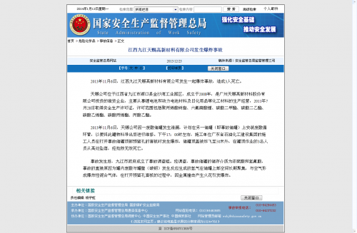 據(jù)國(guó)家安監(jiān)局網(wǎng)站事故信息顯示,2013年11月6日,江西九江天賜高新材料有限公司發(fā)生一起爆炸事故,造成3人死亡。天賜公司位于江西省九江市湖口縣金沙灣工業(yè)園區(qū),成立于2008年,是廣州天賜投資的獨(dú)資企業(yè),主要從事鋰電池和動(dòng)力電池材料及日化用品等化工材料的生產(chǎn)經(jīng)營(yíng),2011年7月28日取得安全生產(chǎn)許可證,許可范圍包括聚丙烯酸樹(shù)脂、六氟磷酸鋰、碳酸二甲酯、碳酸二乙酯、碳酸乙烯酯、碳酸丙烯酯、丙酸乙酯。
