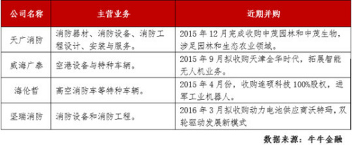 2015年12月,天廣消防完成了對(duì)中茂園林和中茂生物的收購(gòu),公司進(jìn)入園林和生物制品領(lǐng)域,形成了三主業(yè)驅(qū)動(dòng)的發(fā)展模式。海倫哲則是在擁有消防車(chē)輛、特種車(chē)輛的基礎(chǔ)上,收購(gòu)工業(yè)機(jī)器人企業(yè)連碩科技,目前公司消防車(chē)輛、特種車(chē)輛、LED照明、工業(yè)機(jī)器人等多領(lǐng)域發(fā)展,協(xié)同效應(yīng)明顯。而威海廣泰自 2009 年以來(lái),先后收購(gòu)北京中卓時(shí)代、營(yíng)口新山鷹、天津全華時(shí)代(收購(gòu)正在實(shí)施),形成了“以空港設(shè)備為基礎(chǔ)業(yè)務(wù),以消防設(shè)備為發(fā)展業(yè)務(wù),以無(wú)人機(jī)和軍品為新興業(yè)務(wù)”的戰(zhàn)略布局。