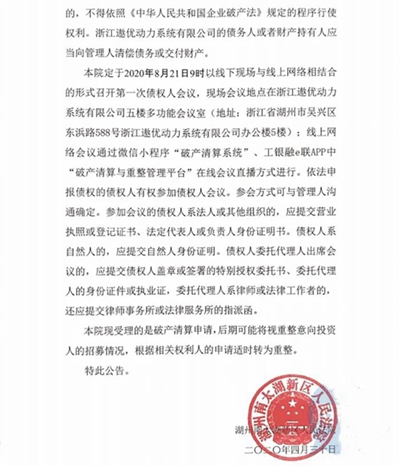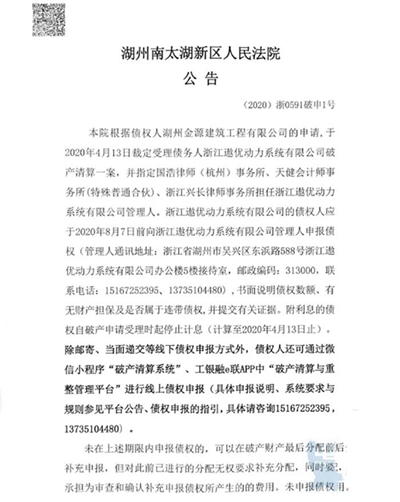隨后,遨優動力的狀況急轉直下。法院公告稱,根據債權人湖州金源建筑工程有限公司的申請,于2020年4月13日受理債務人遨優動力破產清算一案,相關債權人應于2020年8月7日前向遨優動力管理人申報債權。法院公告還顯示,法院受理的是破產清算申請,后期可能將視重整意向投資人的情況,根據相關權利人的申請適時轉為重整。