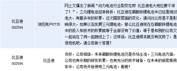 比亞迪(002594)周三在全景網互動平臺上表示,未來磷酸鐵鋰電池仍是市場主流。三元電池方面,公司也有長期的研發積累,也有充分的技術儲備。在未來的新款乘用車中,公司將開始使用三元電池。