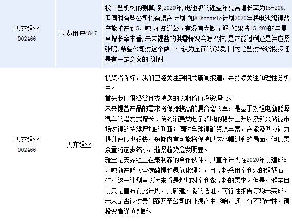 周一天齊鋰業(002466)在全景網互動平臺上表示,未來鋰鹽產品的需求將保持較高的復合增長率,是基于對鋰電新能源汽車的爆發式增長、傳統消費類電子領域的穩步上升以及新興儲能市場對鋰的持續增加的判斷;同時全球鋰礦資源豐富,產能及供應能力提升速度也很快,短期內有可能將保持供應小幅過剩的局面,但供需余量將逐步縮小,趨緊趨勢愈發明顯。