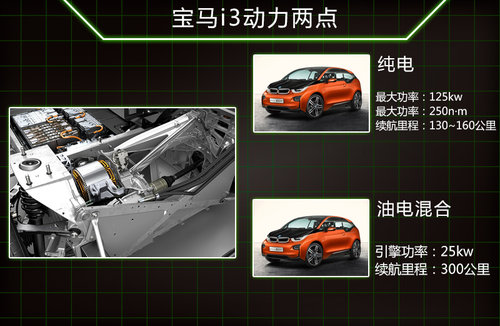 在動(dòng)力上寶馬i3將分為純電動(dòng)版以及油電混合版,在純電動(dòng)版本中寶馬i3配備了一臺(tái)功率最大功率125kw,最大扭矩250nm的電動(dòng)機(jī),讓寶馬i3百公里加速僅為7.2秒,續(xù)航里程在130公里~160公里之間,而帶有雙缸引擎的寶馬i3則最大續(xù)航里程則會(huì)超過(guò)300公里。
