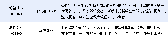 贛鋒鋰業(yè)(002460)周三在全景網(wǎng)互動平臺上表示,公司已經(jīng)完成2萬噸氫氧化鋰項目的可研,預(yù)計今年下半年可以開工建設(shè)。