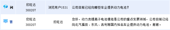 欣旺達(300207)周四在全景網互動平臺上介紹,動力類鋰離子電池模組是公司的重點發展領域,公司目前已經向北汽福田、東風、吉利等國內知名車企提供動力電池。