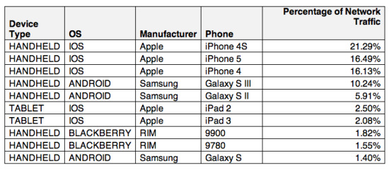 在Actix統(tǒng)計的排名前10的設備中,有3款是Android設備,分別為三星Galaxy S、Galaxy S2和Galaxy S3,而最新的Galaxy S4并不在其中。這3款設備的3G流量總和所占份額不到18%。除此之外,黑莓手機所占份額略高于3%,而諾基亞和其他廠商的產(chǎn)品沒有進入這一榜單。