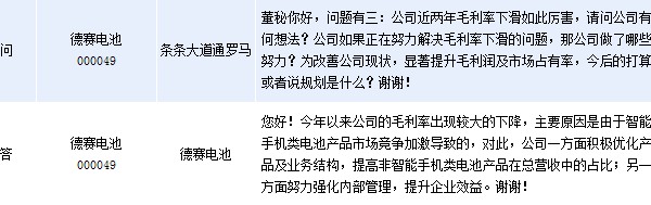 周五德賽電池(000049)在全景網互動平臺上表示, 今年以來公司的毛利率出現較大的下降,主要原因是由于智能手機類電池產品市場競爭加劇導致的,對此,公司一方面積極優化產品及業務結構,提高非智能手機類電池產品在總營收中的占比;另一方面努力強化內部管理,提升企業效益。