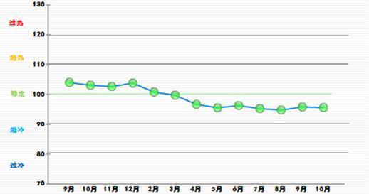 10月份中輕景氣指數為95.62 ,位于“穩(wěn)定”區(qū)域(參見圖1-1)。與9月份相比中輕景氣指數下降0.16。
