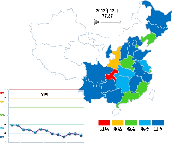 2012年12月,從分地區(qū)電池行業(yè)景氣指數(shù)看,重慶處于“過熱”區(qū),陜西漸熱,遼寧、天津、河南、上海、福建、廣東穩(wěn)定,其他地區(qū)漸冷或過冷。