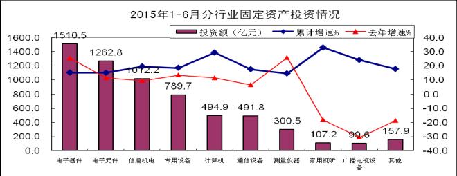 1-6月,電子器件行業完成投資1510.5億元,同比增長15%,低于1-5月0.2個百分點,低于去年同期10.2個百分點,其中集成電路領域完成投資353.62億元,同比增長14.5%,比1-5月提高2個百分點;光電子器件領域完成投資1055.96億元,同比增長18.4%,比1-5月降低1.5個百分點。電子元件行業完成投資1262.9億元,同比增長14.8%,高于1-5月2個百分點。整機行業中,通信設備行業完成投資491.8億元,同比增長17.4%,低于1-5月0.9個百分點,電子計算機和家用視聽行業投資回升,分別完成投資494.9和107.2億元,同比增長29.3%和33%,分別高于1-5月4.4和10個百分點。信息材料投資同比增長17.7%,比1-5月提高10.6個百分比,比去年同期提高38.1個百分點。光伏相關行業投資回升,同比增長52%,比1-5月低10.8個百分比,但仍比去年同期提高55.2個百分點。