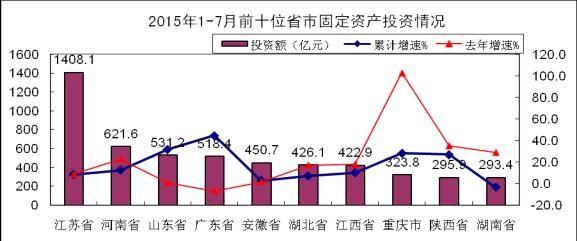 1-7月,東部地區完成投資3553.5億元,同比增長23.3%,比去年同期提高21.1個百分點,高于全國平均水平6.3個百分點,其中北京增長57%,廣東增長44.6%,山東增長31.8%,天津增長15%,上海扭轉負增長態勢,同比增長4.4%。西部地區完成投資1274億元,同比增長23.1%,低于1-6月0.8個百分點,其中四川改變負增長態勢,同比增長0.7%。中部地區完成投資2277億元,同比增長6.5%,高于1-6月1.1個百分點,低于去年同期11.2個百分點,其中湖南投資持續負增長。東北地區完成投資3193億元,同比增長9.5%,低于1-6月13.8個百分點。