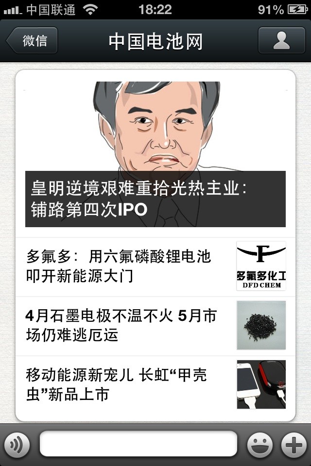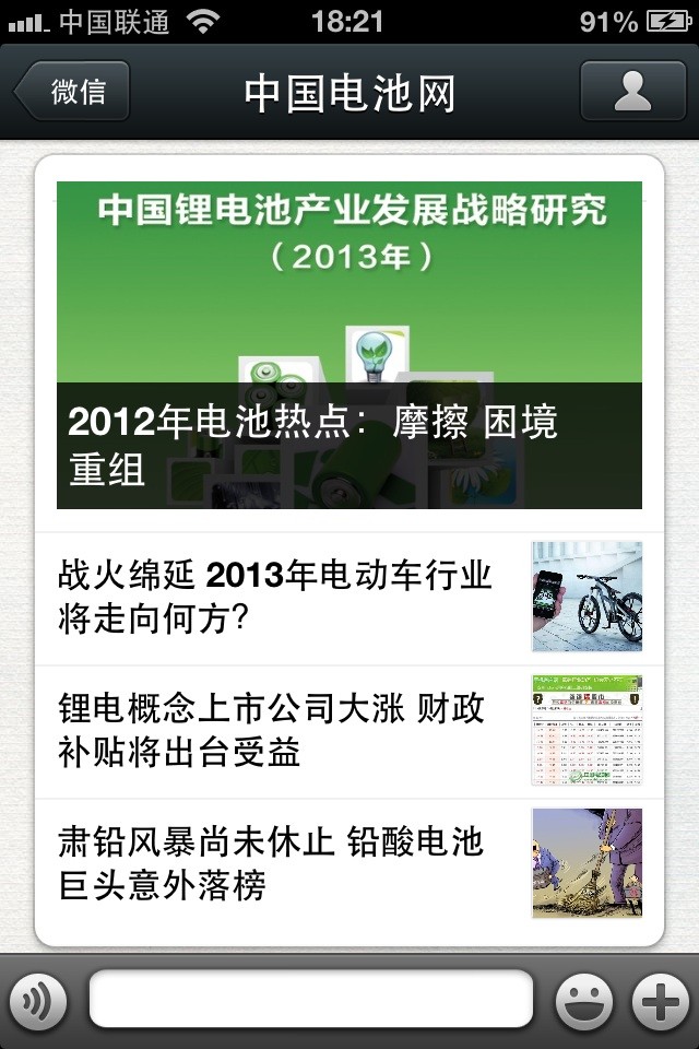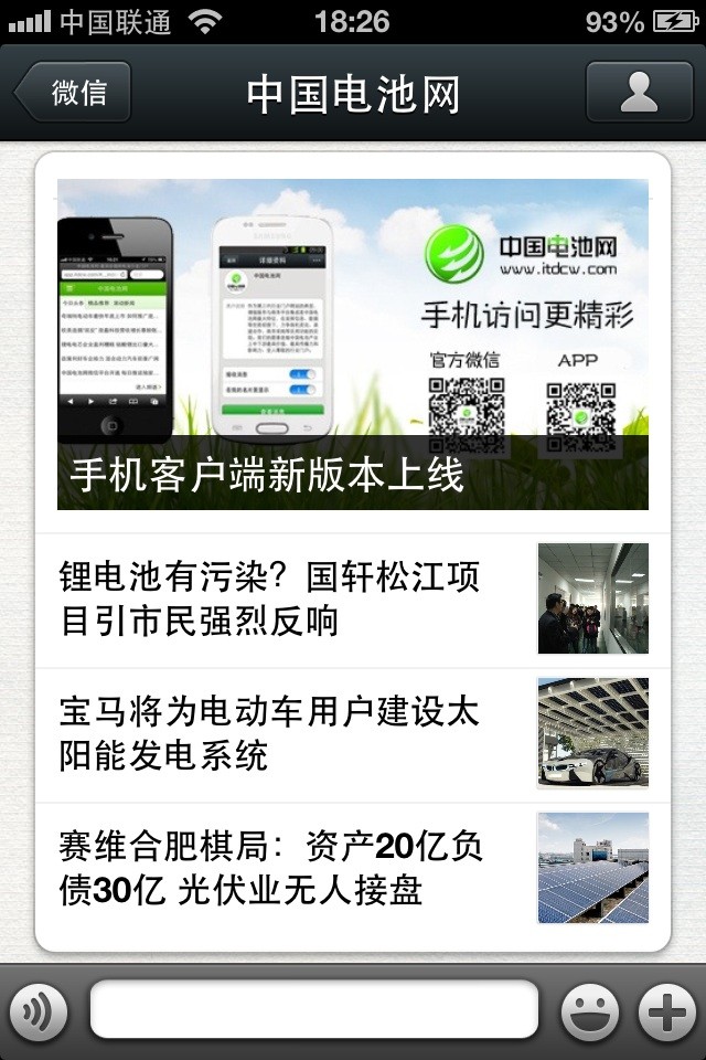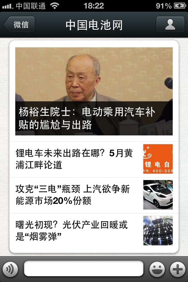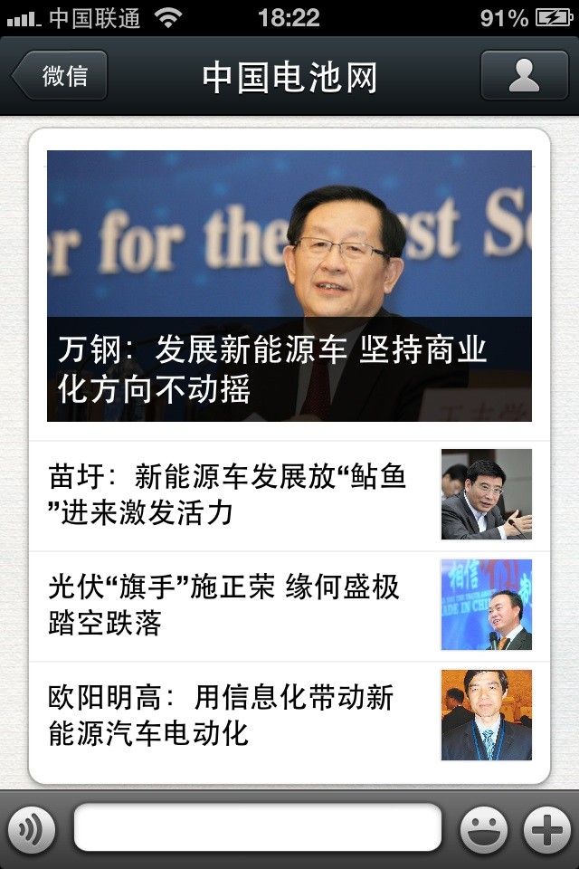 中國電池網(wǎng)的微信(微號:mybattery)已運(yùn)行有6個月了,半年來機(jī)構(gòu)、企業(yè)用戶增加到近兩千,個人用戶也達(dá)到一千多,相比于動輒上萬、十幾萬的微號來說,或許微不足道,但對于中國電池網(wǎng)來說卻是彌足珍貴,這些關(guān)注我們的用戶95%來自電池行業(yè)上中下游、券商機(jī)構(gòu)、VC/PE、能源媒體、國外客戶,是真實(shí)的人、熟悉的人!專業(yè)度高、粘性強(qiáng)、互動性高。甚至有用戶發(fā)來微信,一天不看覺得少了點(diǎn)什么。是的,小微非常榮幸為大家服務(wù),并贏得信任和尊重。小微從中國電池網(wǎng)網(wǎng)站上精選內(nèi)容推送(有不少是獨(dú)家文章),不求最熱但求最有看頭。