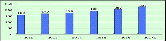 中國再生鉛產量快速增長,從2012年的160萬噸產量上升到2016年207萬噸產量,預計2017年產量可達227萬噸。
