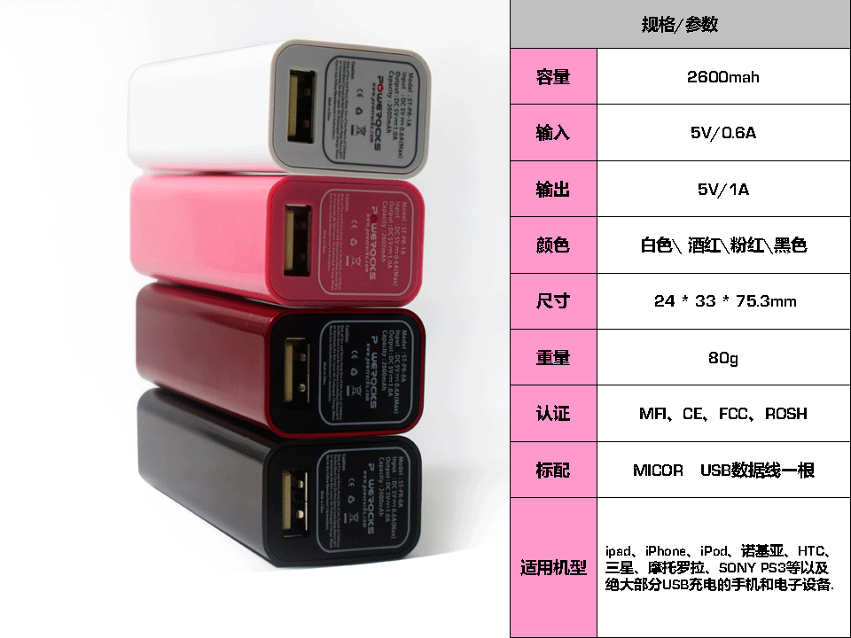 可為ipad、iPhone、htc、Nokia、Blackberry、LG、Samsung等幾乎所有USB充電的智能手機和數碼設備充電,為消費提供理想的充電產品。
