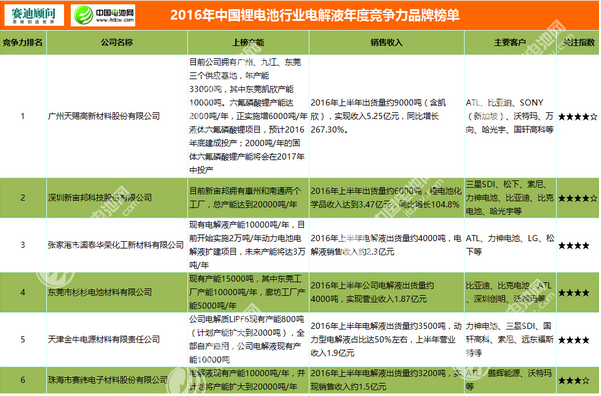 2016年中國鋰電池行業(yè)電解液年度競爭力品牌榜單
