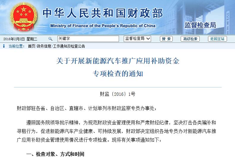 遵照國務院領導批示精神,為規(guī)范財政資金管理使用和嚴肅財經紀律,堅決打擊各類騙補和尋租行為,促進新能源汽車產業(yè)健康、可持續(xù)發(fā)展,財政部決定組織各地專員辦對新能源汽車推廣應用補助資金管理使用情況進行專項檢查。...
