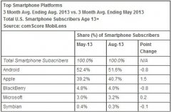 北京時間10月5日消息,據TheNextWeb網站報道,市場調研公司comScore發布截止8月上季度的最新美國智能手機市場份額數據顯示,蘋果以40.7%份額仍然占據市場首位,不僅突破40%大關,同時呈現上漲趨...
